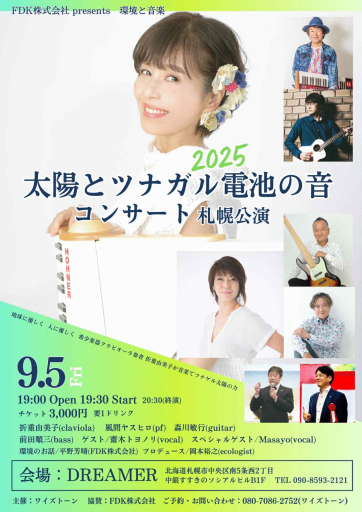 『太陽とツナガル電池の音コンサート』では、FDK製ニッケル水素電池を音源に使用し、“平和と地球環境保護”の願いを込めた音楽活動を行う折重由美子さんが奏でるクラビオーラのサウンドに乗せて“太陽とツナガル電池の音”を世界中の人々に届けています。
